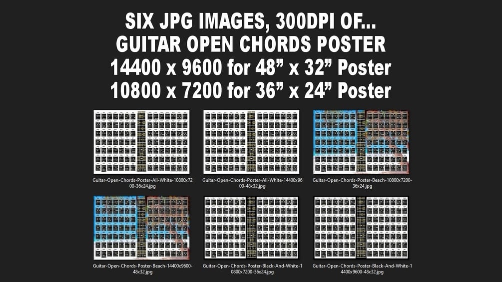 View at Gumroad - You will receive six JPG images at 300dpi resolution of Guitar Open Chords Poster by James Limborg [Two JPG images of the white design, two JPG images of the beach design, and two JPG images of the black and white design]. Three of the JPG images are at 14400 x 9600 pixel size for a 48" x 32" poster. Three of the JPG images are at 10800 x 7200 pixel size for a 36" x 24" poster. You can upload these images to any website that prints posters [Redbubble, Spreadshirt, Uprinting, Amazon, etc.]; The larger the poster the easier it will be to read. You can also use these JPG images on your computer to learn/practice from if you have photo viewing software that lets you zoom into the areas of the poster you want to learn/practice from. These posters include open chords and fretboard notes. After your purchase you will be able to download the .ZIP file containing the six JPG images.